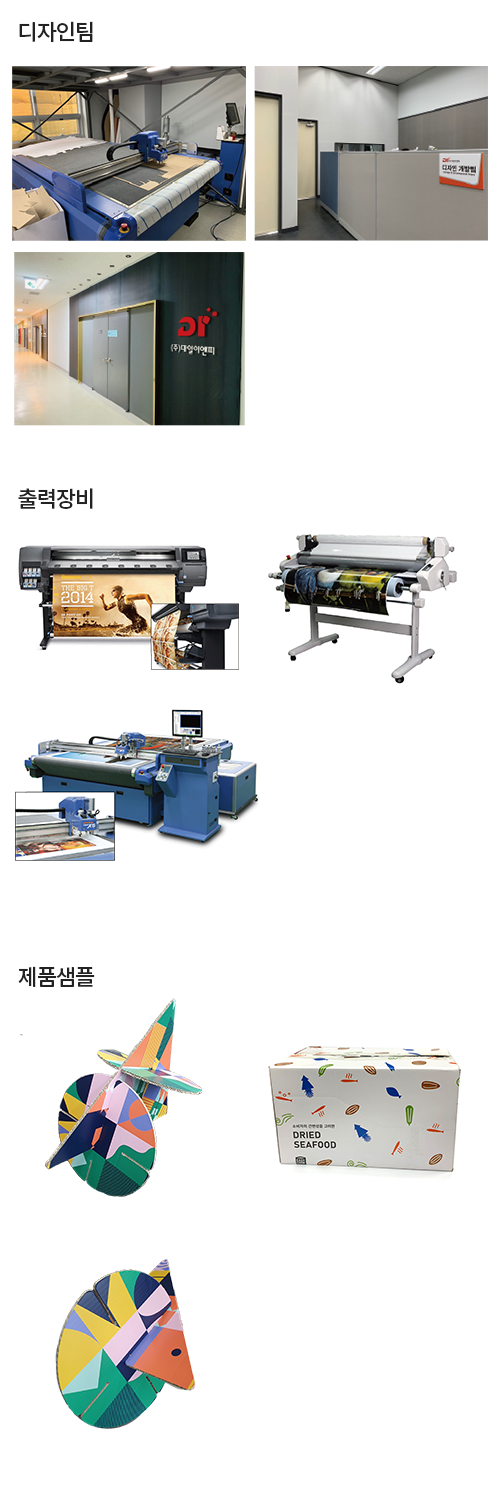 이렇게 작업한 설계도와 디자인을 직접 실물로 구현할 수 있는 실사 샘플 출력기와 코팅기, 커터기를 보유하고 있어 좀 더 빠르게 품질 높은 제품 샘플을 확인할 수 있습니다.